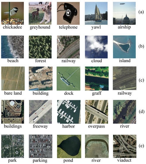 Example samples of the five datasets used in this paper. (a) tiered-ImageNet, (b) NWPU-RESISC45, (c) RSD46-WHU, (d) UC Merced, (e) WHU-RS19.