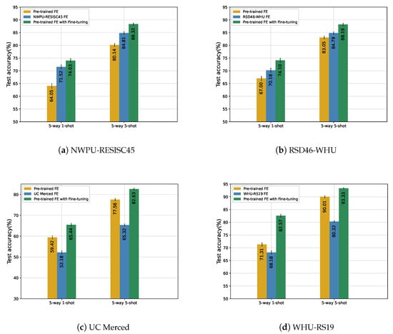 In addition, there is significant improvement in using the pre-trained feature extractor with fine-tuning. For the four remote sensing datasets, the results of the pre-trained feature extractor with fine-tuning reach %, %, %, and % in the 1-shot case, and %, %, %, and % in the 5-shot case, respectively, performing better than the other two types of feature extractor models. This is due to the corresponding remote sensing data being used to fine-tune the model parameters so that the feature extractor can be suitable for remote sensing scene classification tasks.