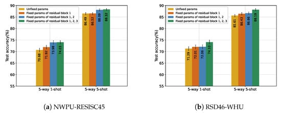 The ablation experiments determine the number of residual blocks with fixed parameters. Figure 6 shows the comparison of the results in four cases: (1) fine-tuning the parameters of four residual blocks; (2) fixing the parameters of the first residual block and fine-tuning the parameters of the remaining residual blocks; (3) fixing the parameters of the first two residual blocks and fine-tuning the parameters of the remaining residual blocks; (4) fixing the parameters of the first three residual blocks and fine-tuning the parameters of the last residual block only. The experimental results in the NWPU-RESISC45 and RSD46-WHU datasets show that the feature extractor achieves the best performance by only fine-tuning the last residual block.