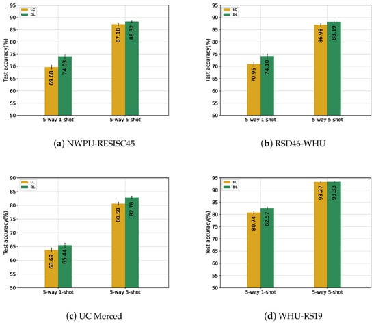For the four remote sensing datasets, the results of our proposed method LC reach %, %, %, and % in the 1-shot case, and %, %, %, and % in the 5-shot case, respectively, achieving worse performances than the LC. The experimental results show that the classification performance will be reduced to different degrees when only the classification error is used, and the reconstruction error is helpful in improving the classification performance further.