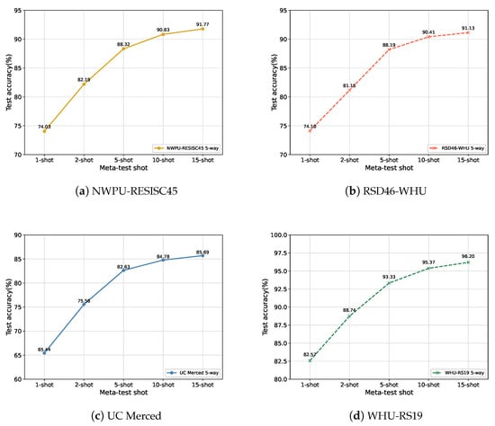 Comparison of different shots for the meta-test on four datasets: (a) NWPU-RESISC45 (b) RSD46-WHU (c) UC Merced (d) WHU-RS19.