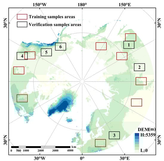 The study area is located in the land area north of a 45° north latitude (from now on, referred to as the Pan-Arctic region), including Asia, Europe, and North America, with a cold climate and extensive snow coverage (Figure 1). The land area covers countries such as Russia, the United States, Canada, Denmark, Norway, Iceland, Sweden, and Finland. In this paper, 38 images were selected as training samples, and 19 images were selected as verification samples. The spatial distribution of training samples is shown in Figure 1. The red box represents the training sample areas; the black box represent the verification sample areas.