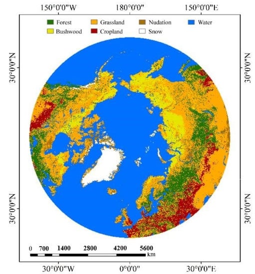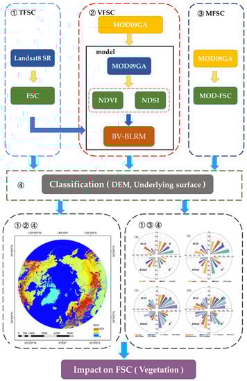 In this paper, we developed the BV-BLRM piecewise linear regression model with NDVI, which is suitable for preparing large-scale, long time series and high-resolution FSC data. We developed a large-scale FSC calculation model BV-BLRM algorithm. At the same time, the FSC data obtained by the SNOMAP algorithm from Landsat 8 SR data were used as the actual-value FSC (TFSC) [34], MODIS/Terra Surface Reflectance Daily L2G Global 1 km and 500 m SIN Grid V006 (MOD09GA) data through the BV-BLRM model were used to calculate FSC (VFSC), and the FSC calculated by the MOD-FSC model was used as the reference FSC (MFSC). Then, the MODIS Terra/Aqua Land Cover Type Yearly L3 Global 500 m SIN Grid V006 (MCD12Q1) data were reclassified into seven different underlying surface types according to the difference in vegetation height and coverage. DEM was divided into seven classes according to different sizes. Finally, the classification verification of the calculated FSC was carried out to illustrate further the error distribution law of FSC in the Pan-Arctic region.