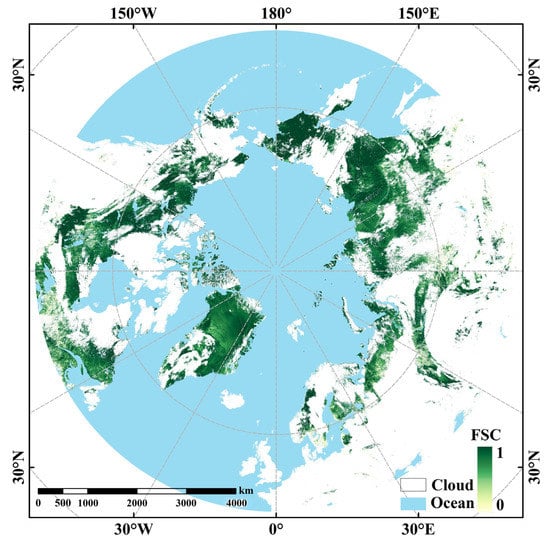 BV-BLRM is used to prepare FSC data in a large area. Figure 5 shows the application results of the model in the Pan-Arctic. For daily FSC data, on land, the white areas are covered with clouds. The FSC of more than 80% of snow area in the Arctic is >0.6; The FSC between 45–60°N is mostly concentrated at 0.1–0.5.