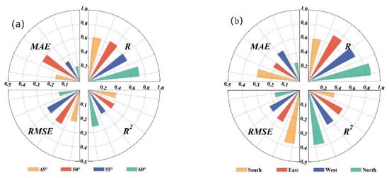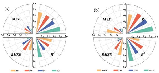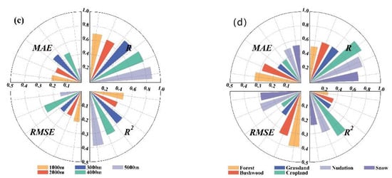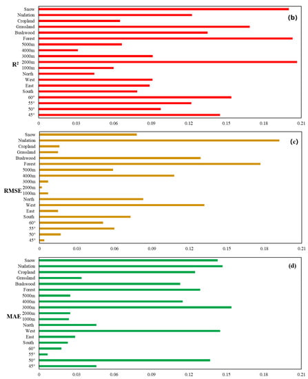 The results show that the highest accuracy is obtained for the north slope, DEM 5000 m, and cropland area. MAE, RMSE, R, and R2 in the north slope were 0.13, 0.17, 0.87, and 0.77. The MAE, RMSE, R, and R2 of DEM 5000 m were 0.01, 0.15, 0.88, and 0.77. The MAE, RMSE, R, and R2 in farmland were 0.19, 0.16, 0.86, and 0.74. The lowest accuracy is 55–59° north latitude, south slope, 0–1000 m, and forest area. The MAE, RMSE, R, and R2 of 55–59° north latitude were 0.16, 0.26, 0.62, and 0.38. On the southern slope, the MAE, RMSE, R, and R2 were 0.29, 0.37, 0.6, and 0.36. The MAE, RMSE, R, and R2 of DEM 0–1000 m were 0.17, 0.19, 0.65, and 0.42. The MAE, RMSE, R, and R2 in forest area were 0.33, 0.39, 0.51, and 0.26 (Figure 9).