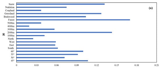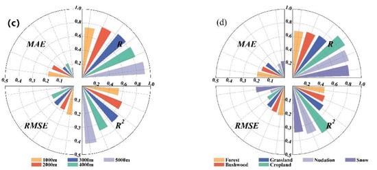 We calculated the R, R2, RMSE, and MAE of the FSC under different classification criteria (Figure 10). The research results show that each category’s accuracy has improved. The three categories with the most improvement are DEM 2000–3000 m and forest and bushwood areas, respectively, with R2 increasing by 0.21 between DEM 2000 and 3000 m. The forest R2 increased by 0.2. The bushwood MAE increased by 0.18. The three categories with the slightest improvement in accuracy were 60°N, DEM 5000 m, and the nudation area (Figure 10).