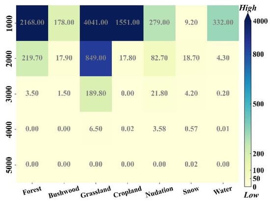 The vertical distribution of vegetation with altitude is shown in Figure 8; among them, the underlying surface has the broadest distribution of grassland, and the underlying surface with an altitude of 1000 m has the most abundant and relatively average types. At altitudes of 2000 m and 3000 m, the proportion of grassland and forest reaches more than 90% of the pixel number of the underlying surface of this category. In terms of the overall accuracy, the accuracy increases with the increase in DEM. The average MAE, RMSE, R, and R2 of FSC calculated by BV-BLRM are 0.108, 0.159, 0.806, and 0.653, respectively. The highest accuracy is in the 5000 m area. MAE, RMSE, R, and R2 are 0.07, 0.09, 0.92, and 0.84, respectively. The lowest accuracy was in the 0–1000 m region, and MAE, RMSE, R, and R2 were 0.07, 0.15, 0.72, and 0.52, respectively (Figure 7c).