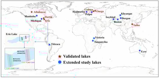 Location of the validated lakes (red stars) and extended study lakes (blue bubbles). The insert map of one example lake (Erie Lake) illustrated the measurements of two-orbit ICESat-2 altimetry observations (lines represent the ICESat-2 footprints of two orbits with three revisit cycles).