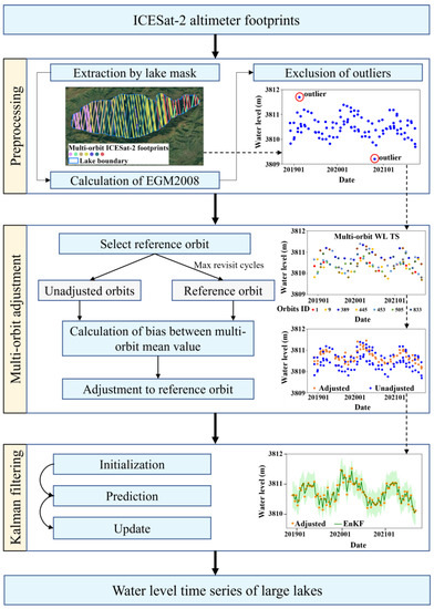 During the latest years (October 2018-) of the mission ICESat-2 retrieved water level, the progress of ICESat-2 in water level observation has been demonstrated and optimized from different application perspectives. Xu et al. [15] applied four data quality flags that come with the ATL13 product to discard the invalid water level observations for global lakes and reservoirs. They also discussed the different influences of flags on valid ICESat-2 observations. Scherer et al. [16] developed a method that can derive the water surface slope of rivers to optimize the river water level observations from the ICESat-2 altimeter. They certified the globally applicable approach to 815 reaches in Europe and North America. In addition, previous studies have focused more on using different methods to filter the ICE-Sat-2 photon data for reducing the uncertainty of water level observations [17,18,19,20,21,22]. For example, Liu et al. [19] used the OpenAltimetry platform (https://openaltimetry.org (accessed on 1 January 2019)) and the outlier elimination method to screen out valid ICESat-2 observations. However, rare studies have focused on high-frequency water level observation by ICESat-2′s multi-orbit adjustment. There are still some barriers to be solved in this field, especially for large lakes.