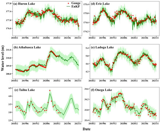 Comparison of water level series of lakes in different sizes by the two Kalman filter methods (KF and EnKF) over (a) Huron Lake, (b) Athabasca Lake, (c) Taihu Lake, (d) Erie Lake, (e) Ladoga Lake, and (f) Onega Lake.