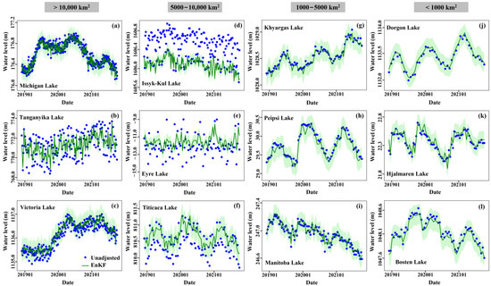 Optimized water level time series of selected lakes derived from multi-orbit ICESat-2 footprints over (a) Michigan Lake, (b) Tanganyika Lake, (c) Victoria Lake, (d) Issyk-Kul Lake, (e) Eyre Lake, (f) Titicaca Lake, (g) Khyargas Lake, (h) Peipsi Lake, (i) Manitoba Lake, (j) Dorgon Lake, (k) Hjalmaren Lake, and (l) Bosten Lake. Blue points represent unadjusted water level time series directly derived from the multi-orbit ICESat-2 observations. The green line represents the time series of lake water levels optimized by multi-orbit adjustment and filtering (EnKF results). The light green range represents the uncertainty of the optimized water level time series.