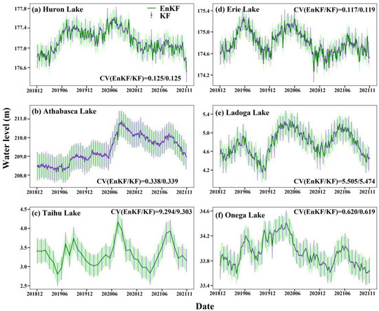 To reveal the influence of the filter step on the synthesized data accuracy in our approach, we compared the performance of the KF and EnKF in densifying and optimizing water level series from the multi-orbit ICESat-2 data. Figure 5 illustrates optimized water level series performances by KF and EnKF for the six validated lakes. Both filter methods perform well in generating smooth and robust trajectories of water level estimates (Figure 5). As an indicator to measure the dispersion degree of water level time series, the CV of the two filter methods is generally consistent (bias range from 0.001% to 0.021%), though EnKF has a slightly better result for most lakes. Further, the CV of six validated lakes is all under 10% (0.125–9.303%). Hence, the step in our approach that has the greatest impact on the densification and optimization of the water level time series could be the multi-orbit adjustment. Generally, the step of the ensemble Kalman filter in our approach only smoothed the water level time series after multi-orbit adjustment but did not densify the final time series.