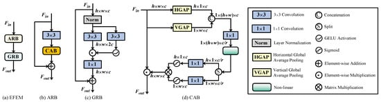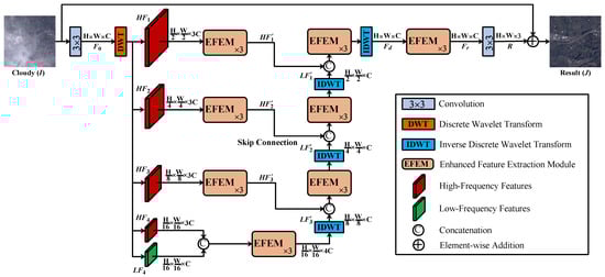 where ⊛ represents the convolution operation. Then, the decomposition continues iteratively on to produce , , , and . Hence, we obtain a total of one low-frequency component and twelve multi-scale high-frequency components. We take as the low-frequency features and concatenate , , and in the channel dimension as the ith level high-frequency features . In the decoding stage, we iteratively concatenate and , feed them into the EFEM for feature extraction, then apply IDWT to reconstruct .