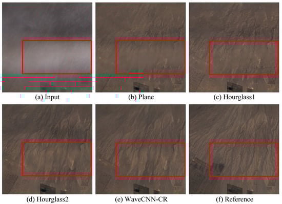 Visual comparisons of different network architectures: (a) input cloudy image; (b–e) respective results of Plane, Hourglass1, Hourglass2, and WaveCNN-CR; (f) reference cloud-free image.