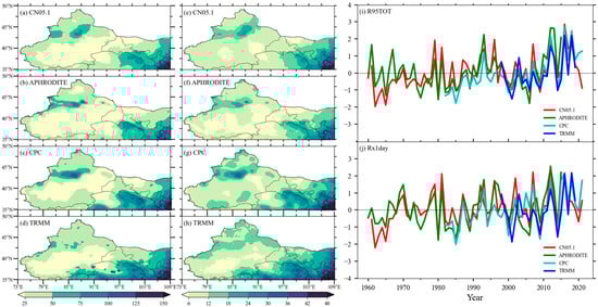 Spatial distributions of R95TOT and Rx1day for (a,e) CN05.1, (b,f) Asian precipitation highly-resolved observational data integration towards evaluation (APHRODITE), (c,g) Climate Prediction Center (CPC), and (d,h) TRMM in Northwest China (NWC) from 1998–2015 (unit: mm). The standard time series of regional averaged (i) R95TOT and (j) Rx1day in NWC are shown.