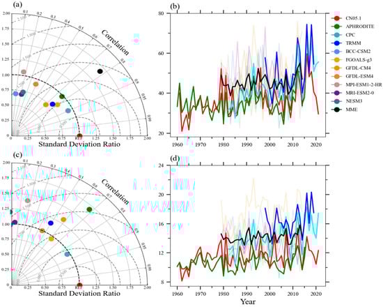 Regardless of general previous knowledge of summer extreme precipitation in NWC, CMIP6 model simulations of the interannual variability of extreme precipitation in NWC were not successful (Figure 3). According to the Taylor diagrams of R95TOT and RX1day in Figure 3a,c, CMIP6 models performed better for RX1day than actual observations. GFDL-CM4 and FGOALS-g3 had higher correlations, lower standard deviation ratios, and lower central root mean square errors; however, in terms of intensity or fluctuation, neither one captured the variability of extreme precipitation in NWC. Furthermore, they appeared to be overestimated (Figure 3b,d). In turn, CMIP6 historical precipitation simulations were driven by historical SST, and state-of-the-art atmospheric general circulation models adjusted for the interannual variability of extreme precipitation in NWC were ineffective in this case. Therefore, a detailed understanding of the dynamic origins of extreme precipitation in NWC is required. Key circulation systems and their fundamental physical processes are critical for improving simulation models and extreme precipitation forecasting.