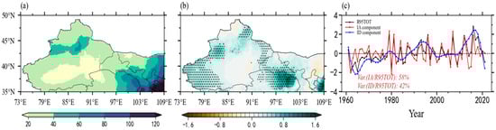Values for R95TOT generally increased in a northwest—southeast direction and were high in the Tienshan and Qilian Mountain areas (Figure 4a). During the years 1961–2021, R95TOT in NWC showed a homogeneous increasing pattern (Figure 4b). The maximum positive was located in the areas of the Tienshan and Qilian Mountains, Pamirs, and southeast NWC, which is consistent with the distribution of precipitation in this region, and with the results of Hu et al. (2019) and Yao et al. (2022). Figure 4c shows the time series of the area-averaged R95TOT in NWC. As can be seen, R95TOT showed significant variability for both interannual and interdecadal time scales. Furthermore, the interannual and interdecadal components accounted for 58% and 42% of the total variance, respectively. Particularly, the interdecadal increase of summer R95TOT in NWC has occurred since the late 1980s, which is consistent with the findings of previous studies and is associated with interdecadal change in moisture flux transport since the late 1980s [37,53].