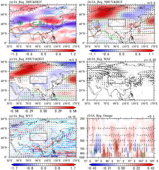 Clearly, there were two significant anomalous anticyclonic systems located over western Europe and northeastern China from 200 hPa (Figure 5a) to 500 hPa (Figure 5b), with NWC between the two high-pressure systems. This was accompanied by a strengthened westerly jet at 200 hPa (Figure 5a) and a weakened SAH. Additionally, there is a well-organized tripole pattern of geopotential height at 500 hPa, and the western portion of NWC exhibits a significant negative center and two positive centers in western Europe and northeast China (Figure 5b). Similar patterns were also found at 850 hPa, except for the Tarim Basin. Most of NWC was influenced by anomalies of negative geopotential height, indicating a quasi-barotropic effect (Figure 5c). Specifically, a wave-like teleconnection can be observed over the Eurasian continent, with convergence-divergence–convergence–divergence WAFs anomalies located over western Europe, Central Asia, NWC, and northeastern Asia (Figure 5d). This anomalous pattern is similar to the conventional EU teleconnection pattern’s negative phase [54]. The horizontal WAFs display the propagation of the teleconnection pattern from the North Atlantic, spreading through Eurasia, and convergent at NWC. Meanwhile, anomalies of anticyclonic winds in western Europe, the Bay of Bengal, and eastern China favor moisture flux transport to the NWC from the northern, southern, and eastern boundaries (Figure 5e). Thus, the coherent, negative, anomalous geopotential height-center from 850 to 200 hPa and the abundant water vapor transport favor the severity of extreme precipitation in NWC. The results of the regression analysis of vertical motion against the interannual R95TOT component further indicated that extreme precipitation over NWC was accompanied by a significant upward vertical motion over NWC, which clearly promoted and sustained extreme precipitation in NWC (Figure 5f).