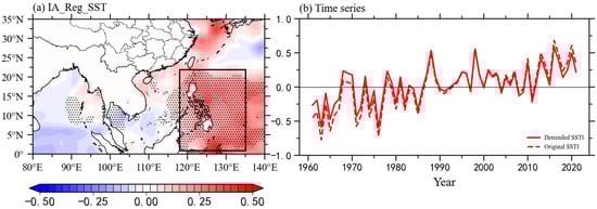 (a) Regression maps of SST (shading; unit: °C) in MJJ with regard to the interannual component of summer R95TOT in NWC. Dotted regions represent regression coefficient significance at the 95% confidence level based on Student’s t-test. (b) Standardized time series of the detrended and original SSTI in MJJ from 1961 to 2021.