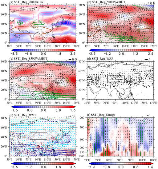 Figure 7 further shows the regression maps of SSTI in MJJ against the interannual summer R95TOT in NWC. Clearly, positive SST anomalies over the western Pacific have a close relationship with increased extreme precipitation, as there are similar circulation anomalies. Anomalous anticyclonic patterns occurred over western Europe and eastern Asia from 200 (Figure 7a) to 500 hPa (Figure 7b). NWC is located between two high pressure systems and the western and eastern regions are influenced by anomalous cyclonic patterns over Central Asia and Mongolia (Figure 7b,c). The westerly jet at 200 hPa is also enhanced, the SAH weakened, and the WPSH is westwardly enhanced. Increased SSTI promotes convection and induces diabatic heating and stimulates the anticyclonic anomaly, which favors the westerly jet and the WPSH via the Gill-type response [56]. Furthermore, a wave-like teleconnection can be seen over the Eurasian continent, which is similar to that in Figure 5d. The horizontal WAFs’ convergence occurred in NWC and increased extreme precipitation events. Figure 5e illustrates WVT anomalies along with an apparent anomalous anticyclonic movement over western Europe with integrated water vapor transport to the northern boundary of NWC. The cyclonic anomaly over the Arabian Sea and the anticyclonic anomaly over the western Pacific are favorable for WVT to the southwestern and eastern boundary of NWC. Thus, abundant WVT converges in NWC and plays an essential role in enhancing extreme precipitation events. Meanwhile, a uniform, upward and significant vertical motion over 79°–100°E promotes extreme precipitation in NWC according to regression of vertical motions.