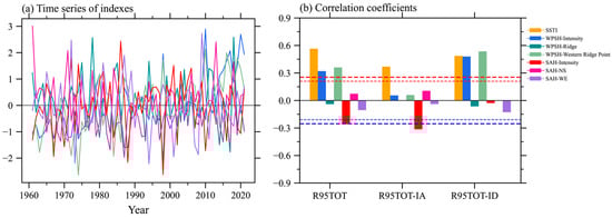 Positive SST anomalies likely favor a wave-like train propagating and guiding more water vapor to NWC. These anomalous atmospheric circulations can be sustained from MJJ to JJA and contribute to the frequent extreme precipitation in NWC (Figure 1 and Figure 2). We also found that WPSH intensity and the western ridge point were strengthened by the occurrence of extreme precipitation, which was accompanied by a decrease in the SAH. Figure 8 further illustrates the correlation between a summer WPSH, SAH, and extreme precipitation in NWC. Consistent with the observed results, the strengthened and western-stretched WPSH significantly correlated with increased extreme precipitation in NWC (Figure 8a,b), with correlation coefficients of 0.33 and 0.41 (above the 99% confidence level). It is worth noting that the WPSH changes play a more important role in the interdecadal-increased R95TOT. Meanwhile, reduced the SAH intensity also benefits R90TOT, and the correlation coefficient between the reduced SAH intensity and R90TOT reached −0.28 at the 99% confidence level. Clearly, the SAH intensity has an impact on interannual R95TOT changes.