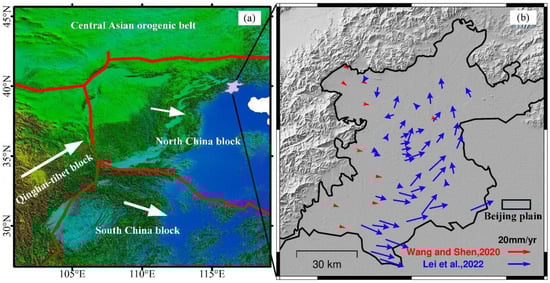 The tectonic plate positions of the Beijing Plain (a) and the GNSS horizontal velocity field in the Beijing Plain area (b) [5,18].
