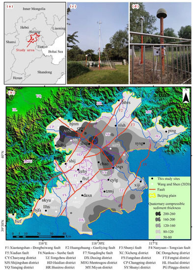 For this paper, the data of 21 GNSS continuous stations in the Beijing Plain area were collected from the International GNSS Service Organization (IGS), the Beijing Global Positioning Integrated Application Service System (Beijing CORS Stations), and the Beijing Meteorological Bureau, in the time span from 1st January 2011 to 15th May 2021. A detailed overview of the station data is shown in Table 1. In addition, we collected and collated the GNSS velocity field data for mainland China published by Wang and Shen [5] in 2020, among which there were 10 stations in the Beijing Plain. The detailed distribution of stations used in this paper is shown in Figure 2b, and the FTXF station from the Beijing Meteorological Bureau is shown in Figure 2c,d.