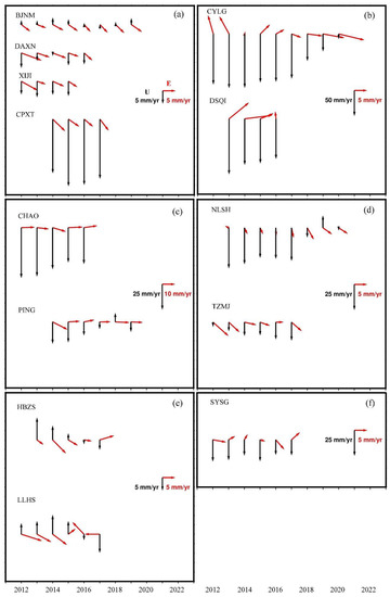Time-series variation trend of the GNSS velocity field at several stations from 2011 to 2021. The length and direction of the red line in the figure represent the speed and direction of the measuring station in the horizontal direction, respectively, while the length and direction of the black line represent the deformation rate and direction of the station in the U component, respectively (for a more detailed explanation, please see Section 4.2).