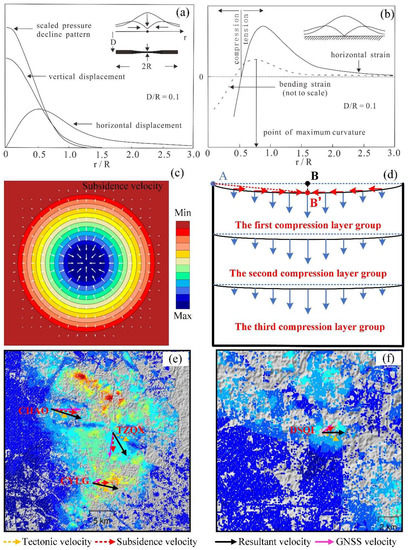 Particle movement direction in the subsidence area: (a) Horizontal and vertical displacement of surface caused by pumping; (b) subsidence profile curvature and horizontal strain; (c) top view, white arrow represents horizontal movement direction of particle, background is subsidence rate diagram; (d) profile view, red arrow indicates horizontal motion direction of particle, blue arrow indicates vertical motion direction of particle; and (e,f) horizontal movement direction of GNSS stations in the study area. Note: (a,b) were modified from Rothenburg et al. (1995).