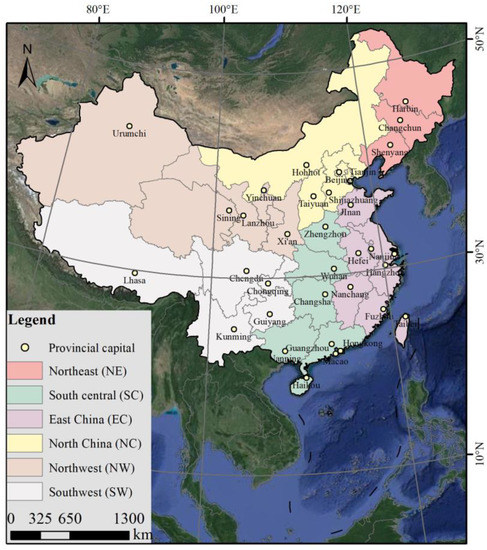 China is located in the east of Eurasia. It has a vast territory, numerous mountains and complex topography. The country is located between 135°2′E and 73°40′E, 3°52′N and 53°33′N. It spans a number of climatic zones, including the monsoon, temperate continental and plateau climate zones that span tropical, subtropical and temperate climates. The average annual temperature in China ranges from above 20 °C in southern China to below −20 °C in the Qinghai-Tibet Plateau. The average annual precipitation ranges from more than 2400 mm in South China to less than 100 mm in Northwest China [24]. In addition, the terrain of the country is extremely rugged and the elevation on the whole is high in the west and low in the east. Due to the diversity of topographic and climatic conditions, the spatial distribution of vegetation is obviously different. Woodland is mainly distributed in Southwest and Northeast China; grassland is more distributed in Northwest China and about one third of bare land is distributed in Northwest China. According to the research needs, China was divided into six geographical regions, as in previous studies, by taking into account the differences in natural conditions and economic development levels and the integrity of administrative regions (Figure 1).