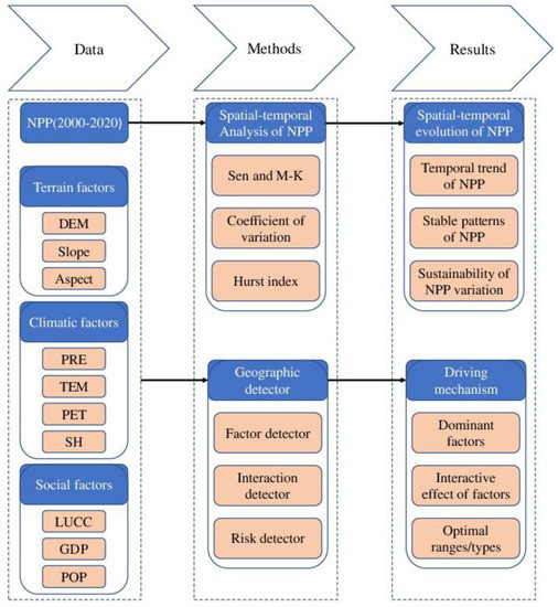 The study data were divided into two categories: NPP data (2000–2020) and the driving forces of NPP. The NPP data came from the Land Processes Distributed Active Archive Center (LP DAAC); the version was MOD17A3 HGF.061 and its spatial resolution was 500 m. The driving forces included topographic data, climate data and economic data. The specific driving factors and corresponding symbols are shown in Table 1 and the flow chart is displayed as Figure 2.