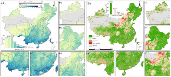 (A,B) Spatial and stable patterns of NPP. (a–e) represent the detailed information for the northwest China, northeast China, Central China, southeast China and southwest China, respectively.