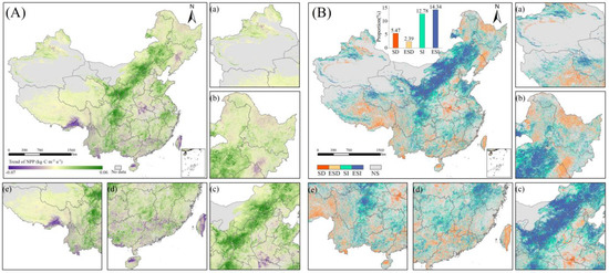(A) Temporal trends of NPP in China between 2000 and 2020 and (B) the spatial distribution of significant (p < 0.05) and very significant (p < 0.01) trends for NPP variation. SD, decreased significantly; ESD, decreased very significantly; SI, increased significantly; ESI, increased very significantly. (a–e) represent the detailed information for the northwest China, northeast China, Central China, southeast China and southwest China, respectively.