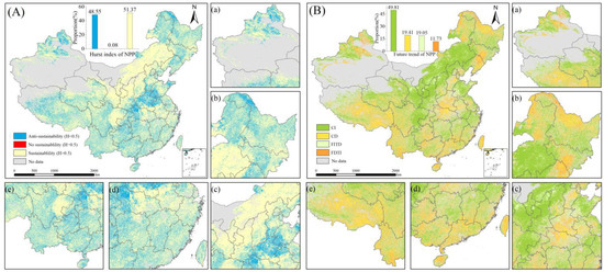 Hurst exponent of NPP (A) and future trend of NPP (B). CI, continue increase; CD, continue decrease; FITD, from an increasing trend to a decreasing trend; FDTI, from a decreasing trend to an increasing trend. (a–e) represent the detailed information for the northwest China, northeast China, Central China, southeast China and southwest China, respectively.