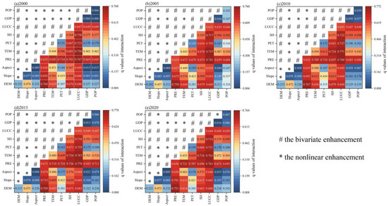 The explanatory power (q value) of interactive effects between influencing factors on NPP are shown (Figure 7). The influences of driving factors on NPP variation are not independent and the effect of any two factors on NPP variation was greater than that of any single factor, manifested as either bivariate enhancement or nonlinear enhancement. Specifically, the interactive effects between LUCC and SH, LUCC and PET, TEM and PRE, and PRE and DEM in the five years were all greater than 0.7 and exhibited bivariate enhancement. Interestingly, the interactions between PRE and slope were lower than 0.7 before 2010, but the explanatory power exceeded 0.7 after 2010, meaning that the bivariate enhancement effect was increased. In terms of TEM and PRE, they illustrated bivariate enhancement and the interaction effect showed a decreasing trend during 2000–2005. However, the bivariate enhancement effect was continually increasing and the explanatory power exceeded 0.7 during 2010–2020. The interactive effects between DEM and slope; aspect and slope, aspect and TEM, PET, GDP and POP. and aspect and PET and GDP all exhibited nonlinear enhancement in the five years, but the explanatory power was less than 0.6 in each case.
