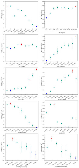 The knowledge of the optimal adaption ranges of factors that affect vegetation NPP would help decision makers improve the ecological environment for vegetation growth [62]. Topographic factors are usually regarded as having vital roles in regulating NPP’s spatial distribution through the control of water, thermal changes and soil conditions and result in essential effects on the surrounding environment of vegetation [63]. In terms of DEM, the maximum NPP occurred when the DEM was lower than 403 m, indicating that a lower altitude is beneficial to vegetation growth and promotes NPP increase. This may have resulted from a lower altitude, usually accompanied by a warmer temperature, and this may have partly increased the activity of photosynthetic enzymes, decreased the rates of chlorophyll degradation, improved the capacity of photosynthesis [7] and finally, increased NPP. However, a lower altitude is usually accompanied by intense anthropogenic activities (e.g., land use and land cover change), which may have a negative impact through increasing the NPP.