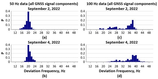 The deviation frequency distribution obtained from 50 Hz (a,b) and 100 Hz (c,d) data of all GNSS signal components by Septentrio receiver under quiet conditions (a,c) and under magnetic storm (b,d).