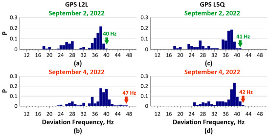 The deviation frequency fd distribution for 100 Hz data of L2L and L5Q GPS signals under quiet conditions on 2 September 2022 (a,c) and during the magnetic storm on 4 September 2022 (b,d).