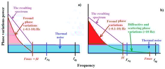 In a reality, however, there are always mechanisms producing the phase variations in the ionosphere at frequencies higher than 10 Hz. There is ionospheric diffraction from the small-scale ionospheric turbulences with a size of less than a hundred meters and the wave scattering from Fresnel ionospheric turbulences. Both of these ionospheric effects produce ionospheric noise spectra coming into the other noise components (thermal noise etc.). This case is illustrated in Figure 7b. The main problem is that very little can be known about the high-frequency truncation of such phase variations’ spectra, because the above-mentioned noise ionospheric variations may occur well above the sampling frequency. Hence, the noise tail of the phase variation spectra produces aliasing effects, because 100 Hz sampling frequency is probably less than double maximal frequency of the ionospheric noise variations in the spectrum. Our results where fd is found close to Nyquist frequency prove that 100 Hz sampling frequency is not always enough to define such high frequency ionosphere produced phase noises.