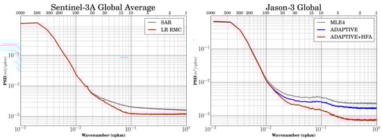 Power spectral density of the SLA along S3A (left) and J3 (right) tracks estimated using different processes. For S3A, conventional SAR (gray) and new LR-RMC (red) processors are presented. For J3, conventional MLE4 (gray), new adaptive (including revised SSB; blue), and new adaptive combined with HFA correction (red) processors are presented. Wavelengths (in km) are given on the top axis.