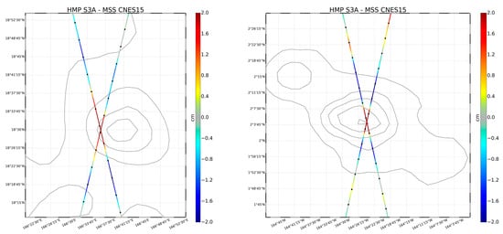 The HMP content is illustrated in Figure 2, which shows the differences between the CNES_CLS15 gridded MSS model and the S3A HMP when S3A flew over a small seamount, underlined by the bathymetric contour lines (black lines). The positive anomalies in the HMP–MSS differences correspond to an additional signal in the HMP not present in the gridded reference MSS. Here, the HMP–MSS differences highlight the signature of the bathymetric structure, which is flattened in the gridded reference MSS and more clearly represented in the HMP. The good consistency of the signal observed along both the S3A tracks crossing the structure allows us to have confidence in the representation of this additional signal observed in the HMP. We also note that the seamount signature on the HMP shows up at short wavelengths. The positive values crossing the seamount cover a section about 15–20 km long. This means that such a structure is difficult to accurately capture with 1 Hz altimeter measurements at a sampling rate close to the Nyquist frequency. This also underscores the value in processing the altimeter measurements at a high resolution for a more accurate MSS estimation.