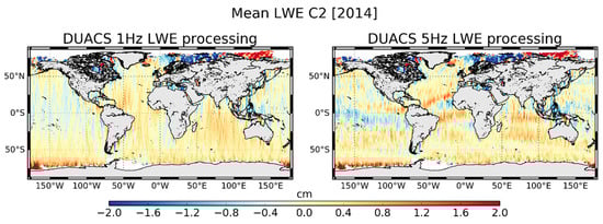 Mean LWE correction for C2 data in 2014. LWE correction obtained when applying the DUACS 1Hz processor (left) and 5Hz processor (right).