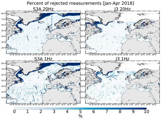 Percentage of rejected measurements for S3A (left) and J3 (right) missions for January–April 2018. Results obtained for 20 Hz (top) and 1 Hz (bottom) measurements selected with the respective editing strategy.