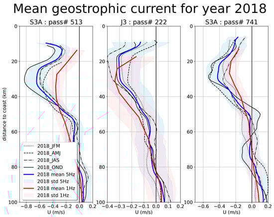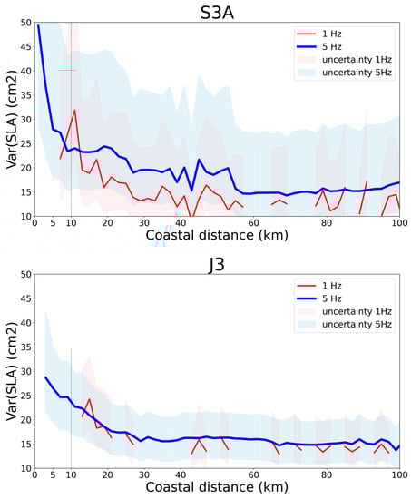 We first note that, especially for the J3 mission, the data availability near and even far from the coast is degraded when using the 1 Hz product. This explains the discontinuities in the statistical plots for the 1 Hz product. The reduced availability of the 1 Hz product is caused by the more severe data selection criteria applied, as discussed before. The lower sampling rate is also a factor, since with a distance of nearly 7 km between consecutive measurements, and with a restricted number of passes in this area (five passes), there is a lower likelihood of filling all the coastal distance bins. We also see that for both J3 and S3A, the SLA variance level is slightly higher for the 5 Hz product than the 1 Hz. For J3, it reaches 15.3 cm2 for the 1 Hz and 16.3 cm2 for the 5 Hz product. For S3A, it reaches 14.7 cm2 for the 1 Hz and 17.9 cm2 for the 5 Hz product. This is explained by the different cut-off wavelengths used for the signal filtering, ranging from 35 km for S3A to 55 km for J3 at 5 Hz (see Section 2.3), and 65 km at 1 Hz. We note, however, that the difference remains low when considering the different noise levels in the upstream products used (i.e., noise variance is reduced by a factor of 20 in the 1 Hz upstream product compared with the 20 Hz due to the 1 Hz compression). This result is made possible by the innovative processing applied for these two missions (see Section 2.1), significantly reducing the noise level for the 20 Hz measurements.