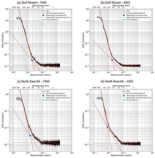 As before, the full-rate (20 Hz) measurements are used in order to access the full spectral content. Although LR-RMC processing significantly reduces the measurement errors linked to swell [29], only measurements associated with low SWH (below 4 m) have been considered in order to avoid the possible contamination of the signal with residual errors. The SLA PDS has been analyzed over two different areas: the Gulf Stream core, and a less energetic area located further east in the Atlantic Ocean (precise coordinates are given in Table 5). The mean SLA PDS over the years 2017 and 2018 and for the winter (February–March–April; FMA) and summer (August–September–October; ASO) seasons have been analyzed. The spectral decomposition used is similar to the one proposed by [73]. It consists of first estimating the noise level—represented by the flat signal at the shorter wavelengths (<10 km)—then the slope characterizing the geostrophic or mesoscale signal—usually well-defined at wavelengths > ~150 km—and a second slope expected to be representative of the unbalanced motion visible at the small mesoscale. Mesoscale and small-mesoscale slopes are fitted on the noise-corrected PDS using a two-line sum model. The results obtained are presented in Figure 6 and show the mean PSDs for the regions and seasons considered. The black line represents the true PSD deduced from the altimeter measurements. The 95% confidence interval is represented by the light gray band centered on the true PSD. The three slopes deduced from the spectral decomposition are shown as dashed red lines. The thick red line shows the theoretical spectrum deduced from the sum of the three different slopes. Finally, the transition scale (Lt) defined for where the mesoscale (balanced motion) to small-mesoscale (unbalanced motion) signal ratio is equal to 1, is represented by the blue star. Details of the characteristics of the different PSDs are given in Table 5.