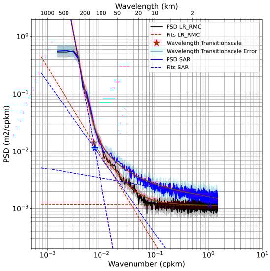 The LR-RMC method is an experimental process developed by CNES. It is close to the current SAR processor. However, it combines the beams produced in a radar cycle differently in order to enlarge the effective footprint of the measurement and average out the effects of the sea-surface state, especially wind waves and swells that are known to impact SAR-mode performance at the short mesoscale (<~50 km). Consequently, the red noise usually observed in the spectrum of SAR sea level anomalies at short wavelengths [59] is reduced, and so is the measurement noise level, which is illustrated in Figure 1. The gray spectrum corresponds to the SAR processor. It has a slightly negative slope, or “red” noise, at short wavelengths (<~50 km). Part of this error signal is assumed to be correlated with swell conditions, as demonstrated by [59]. The red spectrum was generated using the LR-RMC process. In this case, the result obtained is closer to the theoretical spectrum expected, with the noise plateau visible at short wavelengths and the signal’s spectral slope visible at higher wavelengths. A direct impact of this LR-RMC processing is a reduction in the errors at short wavelengths, allowing us to better observe the short mesoscale signal of interest.