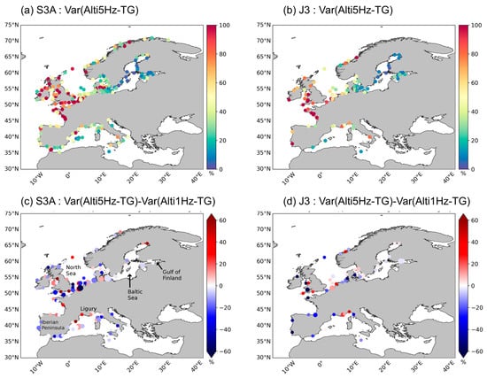 The dense tide gauge (TG) network provided by the Copernicus Marine Service (CMEMS) over European waters was used to assess the quality of the altimeter measurements. The methodology used is derived from the one described in [75] and can be summarized as follows: First, TG series with anomalous events or with significantly higher variance (more than 20 cm2) than the altimeter data are rejected. Then, selected TG series are processed in order to obtain an SSH signal comparable to the altimeter measurement content. The tidal signal is removed using a harmonic decomposition proposed by [76]; the dynamical atmospheric signal [17], also corrected for in-altimeter measurements, is removed from the TG signal. To do so, the TG series are first converted into 6-hourly records; vertical motions linked to the post-glacial rebound are also removed from the TG signal using the Peltier model [77,78]. After that, TGs and altimeter measurements are collocated using the maximal correlation score within a 25 km area around the TG stations. Note that this distance is reduced compared with the one used in [75] (i.e., ~100 km) in order to better focus on near-coast measurements. The next step consists of rejecting time series less than 10-months long to guarantee statistical significance. Finally, global mean statistics are computed. With the aim of reconciling the different spatial sampling capabilities between the TG network and the altimetry, different weights were used for the different TG stations selected. The weights depend on the number of neighboring TGs (a maximal distance criterion of ~100 km was used), which are compared with an altimeter measurement and aligned along the same altimeter ground track. This processing was applied to S3A and J3 1 Hz and 5 Hz products. A filtered SLA signal, as disseminated in both 1 Hz and 5 Hz altimeter products, was used. The results are compared for TG stations that are common to both altimeter products. The data were compared over the period from July 2016 to September 2018.
