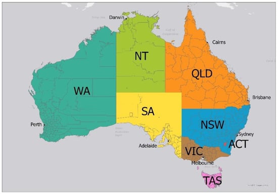 Map of the study area, state, and territory boundaries as well as Local Government Area (LGA) divisions and major cities. States and territories: Western Australia (WA), Northern Territory (NT), Queensland (QLD), South Australia (SA), New South Wales (NSW), Australian Capital Territory (ACT), Victoria (VIC), and Tasmania (TAS) are labelled.