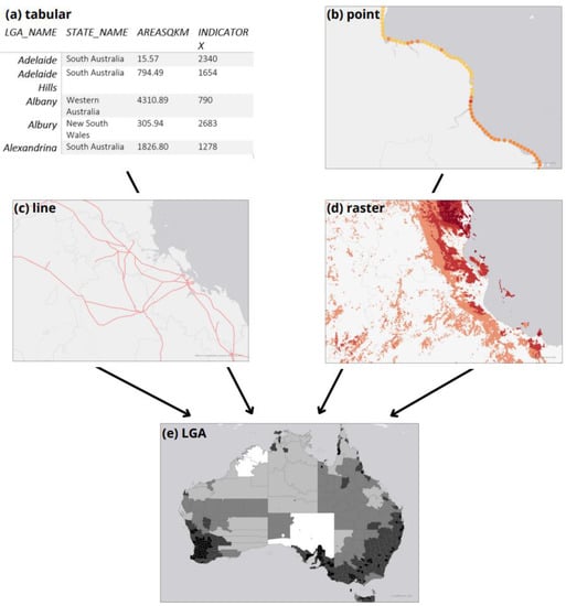 Diagram representing data formats of acquired raw data (tabular (a), point (b), line (c), and raster (d)) being transformed into a comparable LGA polygon format (e). Example data are used here, and (d) is not representative of any results.