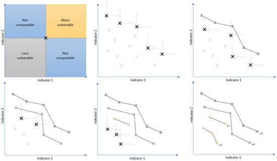 Pareto ranking, also known as Pareto front optimisation or multi-objective optimisation, was investigated to address some of the limitations of the equal weighting method. Pareto ranking can be used to construct an effective vulnerability index without weighting individual indicators [35,36]. It involves finding the values along the Pareto front, which are values considered to be non-dominated in all indicator axes, and ranking these fronts in order. The process is depicted in Figure 4, which shows a step-by-step process of identifying non-dominated data points.